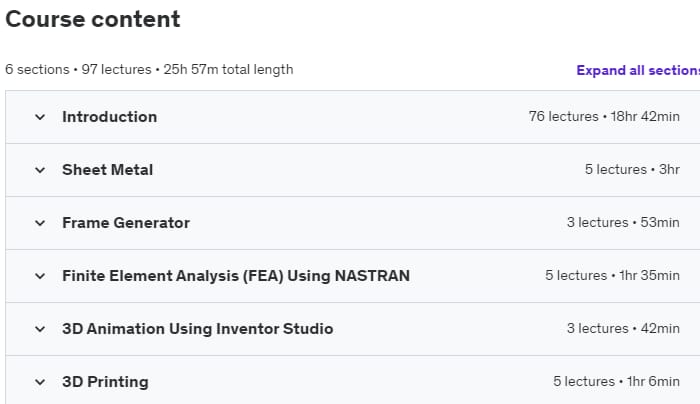 El curso comienza con los fundamentos del software y continúa con técnicas más avanzadas como la chapa metálica, el análisis de elementos finitos (FEA) con NASTRAN, la animación 3D y la impresión 3D.